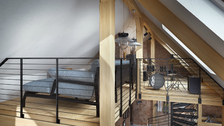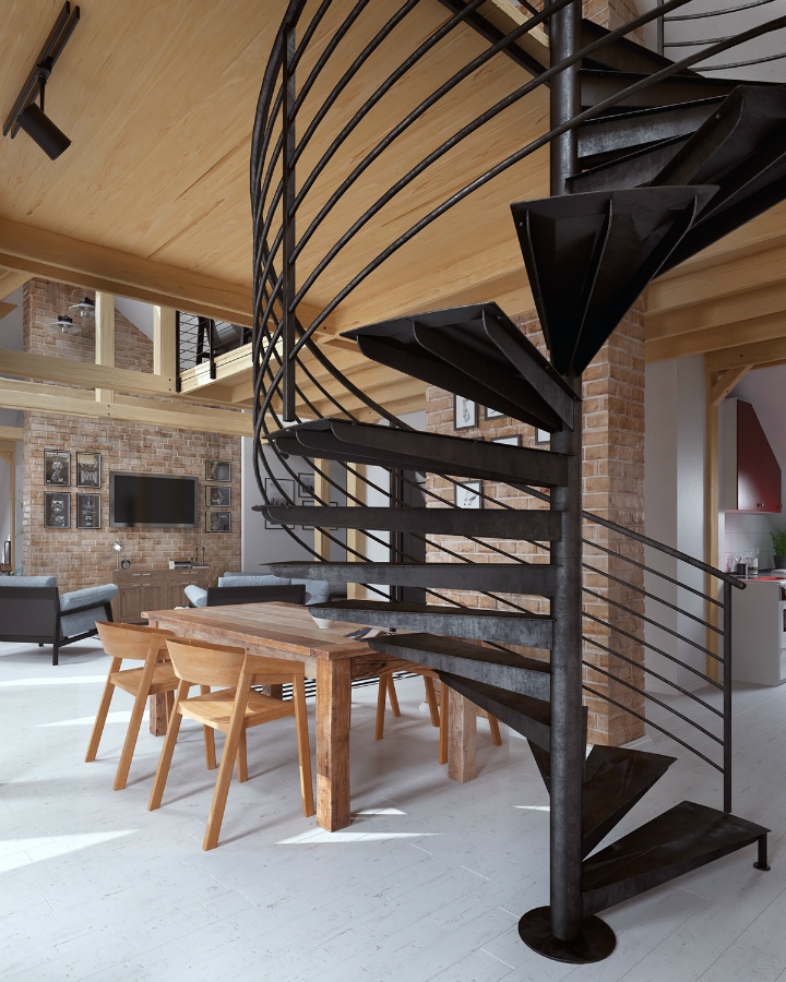 Ce qui se remarque le plus, c’est bien évidemment ces poutres apparentes qui semblent faire le tour de la maison ; un véritable fil rouge dans la décoration. Ici, deux bois clairs ont été utilisés. Nous avons principalement du bois de bouleau européen avec un grain fin et un peu de bois d’érable.