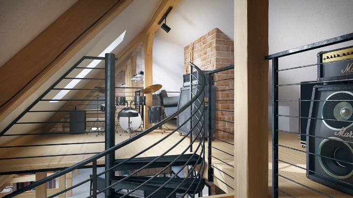Conçu par les studios CGForge, ce décor a de quoi surprendre. Ici, les bois ont été conservés dans leur état le plus brut ou ont été traités avec des couleurs claires afin d’être vus et d’être presque en opposition avec le reste des éléments. Grâce eux, ce grand espace ouvert est harmonisé et lumineux.