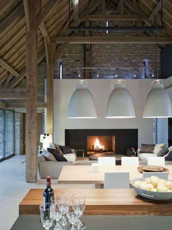 Personnellement, j’ai un coup de cœur pour la pièce principale de cette ancienne grange. Cette pièce avec une hauteur sous plafond de neuf mètres offre des volumes et une architecture exceptionnelle. Laisser les poutres en chêne apparentes de la charpente de la grange apporte encore un peu plus de cachet et donne un petit côté rustique parfaitement adapté à la demeure.
