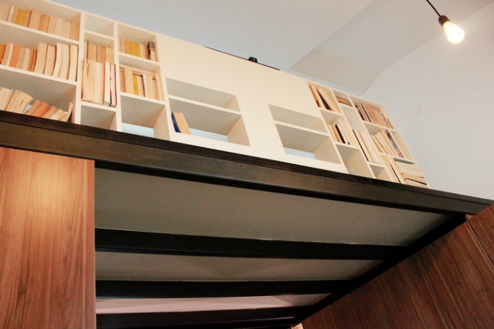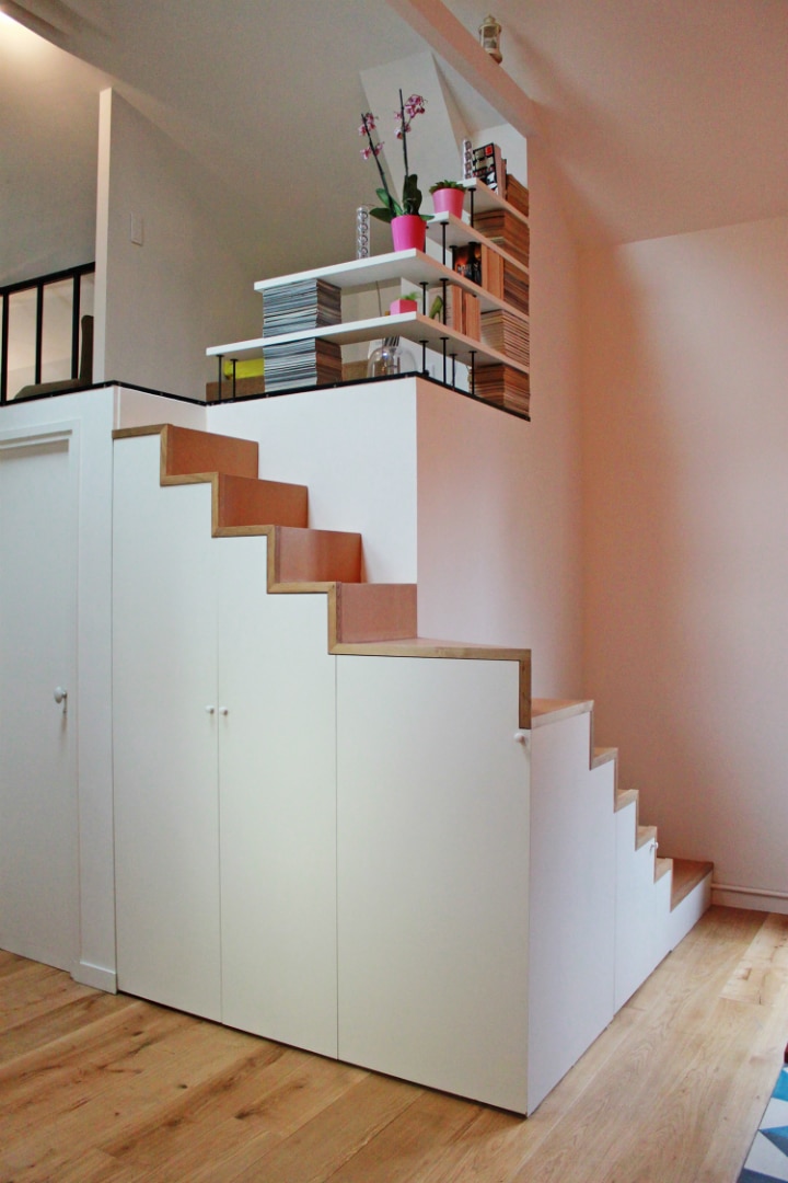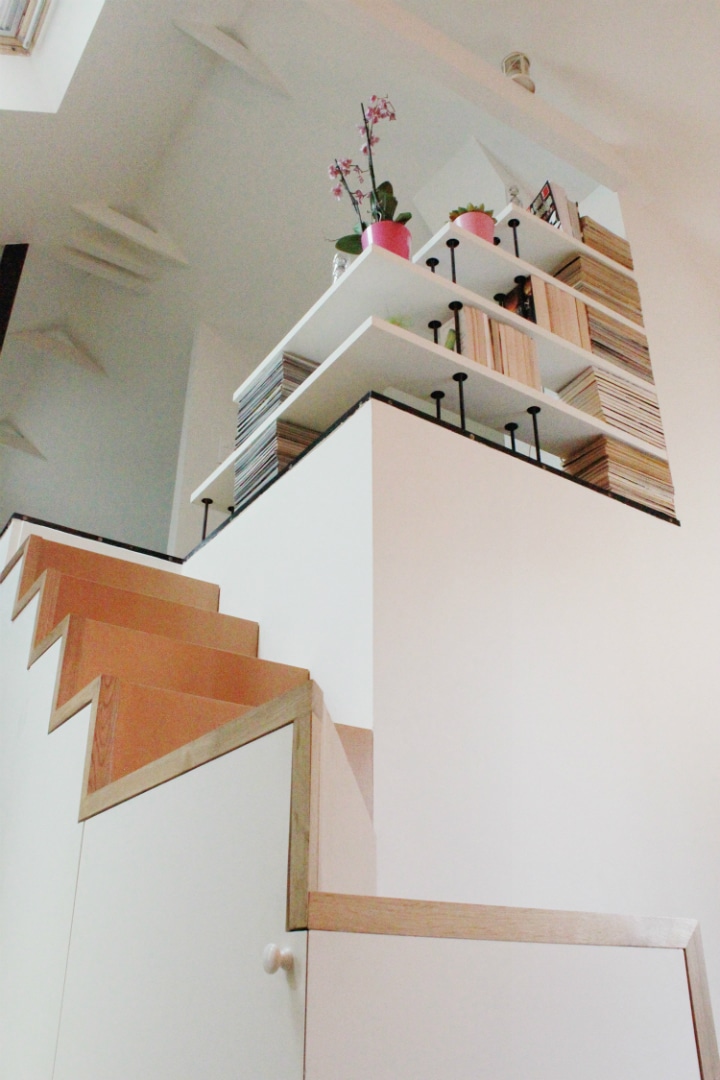 Mais passons à ce qui nous intéresse le plus ici : les deux mezzanines. Pour y accéder, un escalier assez raide mais qui permet de gagner beaucoup de place. D’ailleurs, pour ne pas perdre d’espace, l’escalier est également un placard.