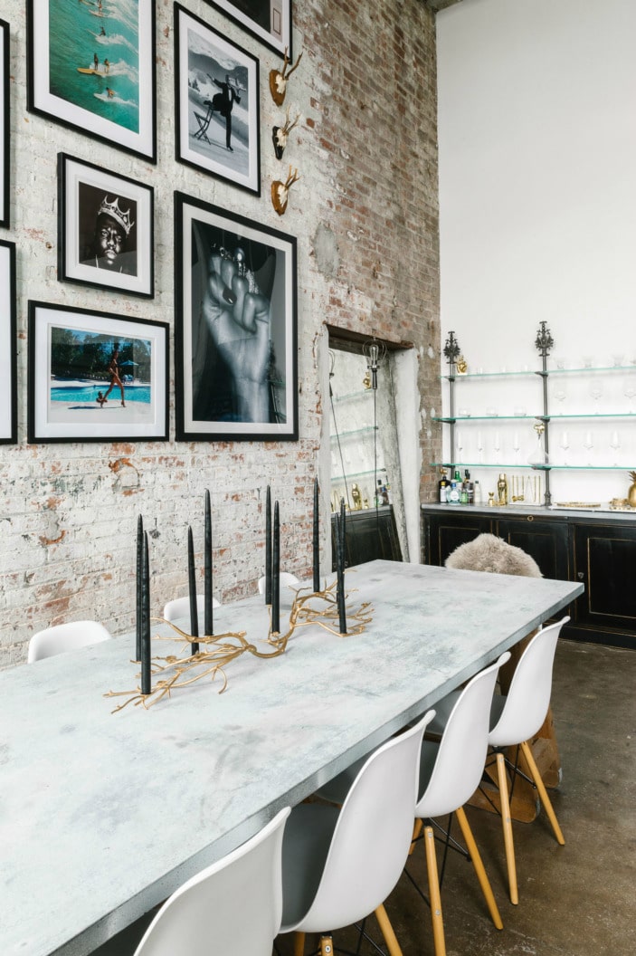 Comme élément focal pour le mur opposé, un mélange éclectique de photographies encadrées et d’échantillons de taxidermie a été utilisé suspendus. Juste en-dessous, un espace salle à manger a été créé par les propriétaires afin d’adoucir la froideur de l’espace ; sans pour autant sacrifier la surface.