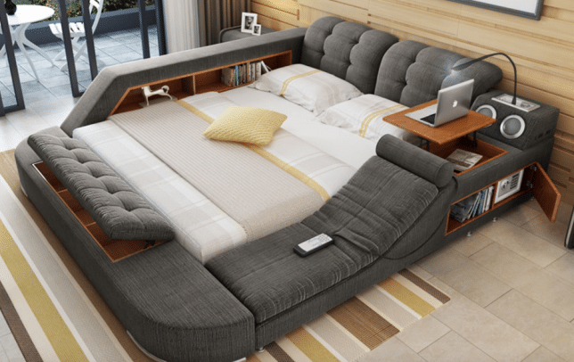 Ce lit multifonction dispose notamment de prises USB, de prises 220 volts et de haut-parleurs intégrés. Mais ça n’est pas tout ! S’il est vendu avec ou sans matelas, il est aussi vendu avec un espace de massage où vous pourrez vous allonger pour vous détendre avant d’aller vous coucher. Autre accessoire : une petite tablette vous permet de poser votre ordinateur portable pour lire vos emails ou regarder une série sur Netflix.