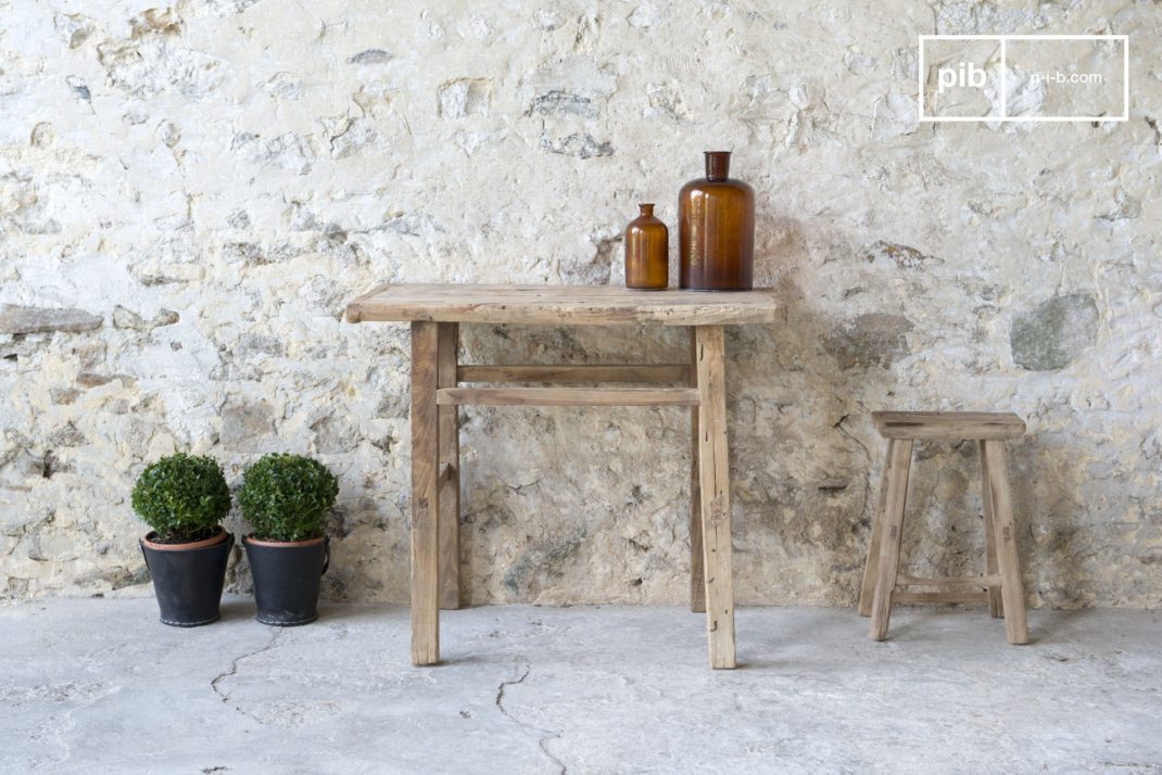 La première est constituée d’un piétement métallique et d’un plateau de bois épais. Ce qui me plait dans ce modèle, c’est sa forme massive, son bois recyclé et le souci des détails.