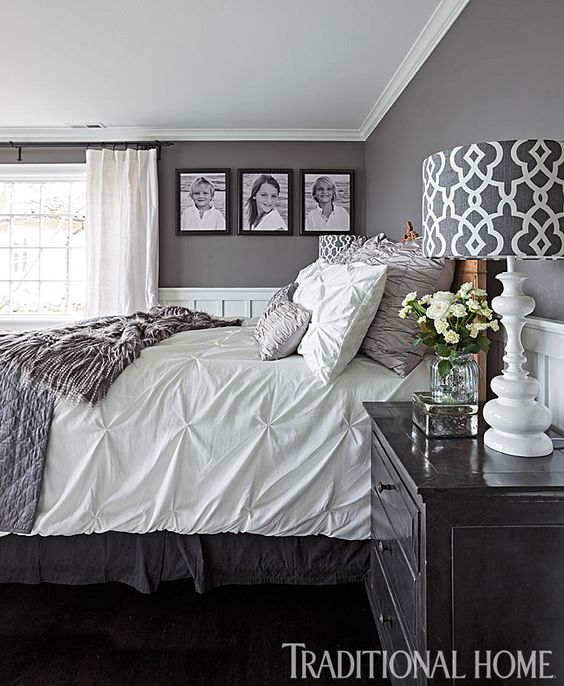 La combinaison du blanc et du gris sublime naturellement les volumes d’une chambre. Un mur peint en gris perle adossé à des boiseries blanches structure l’espace tout en préservant sa luminosité.