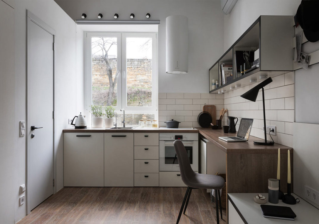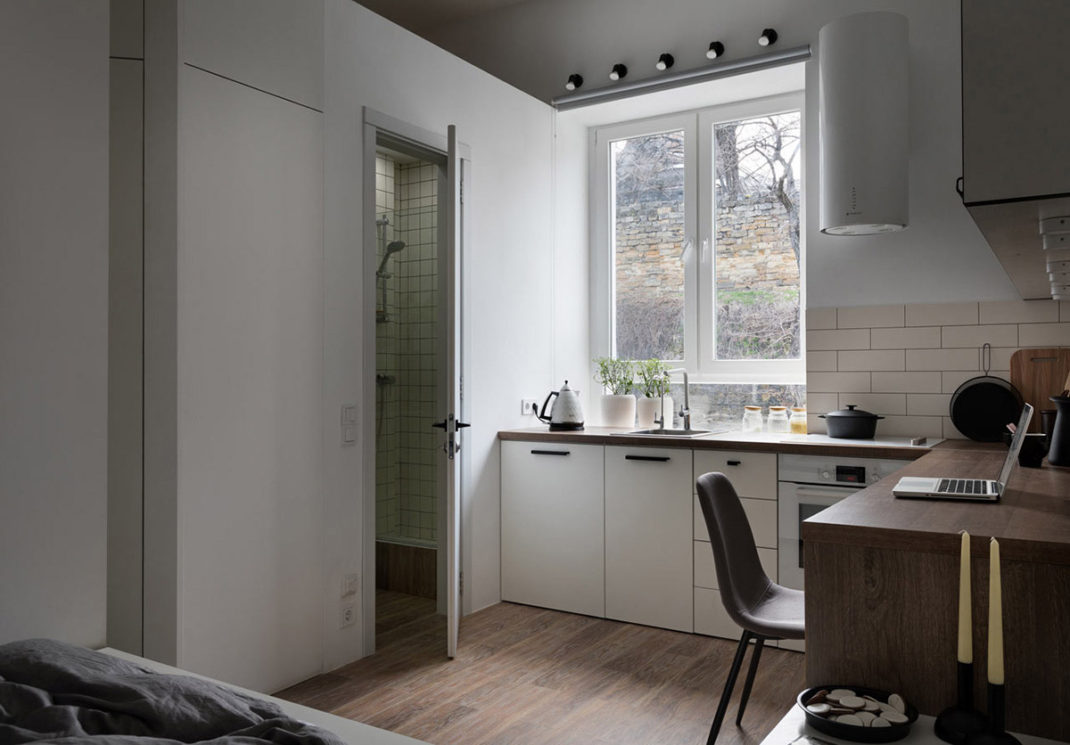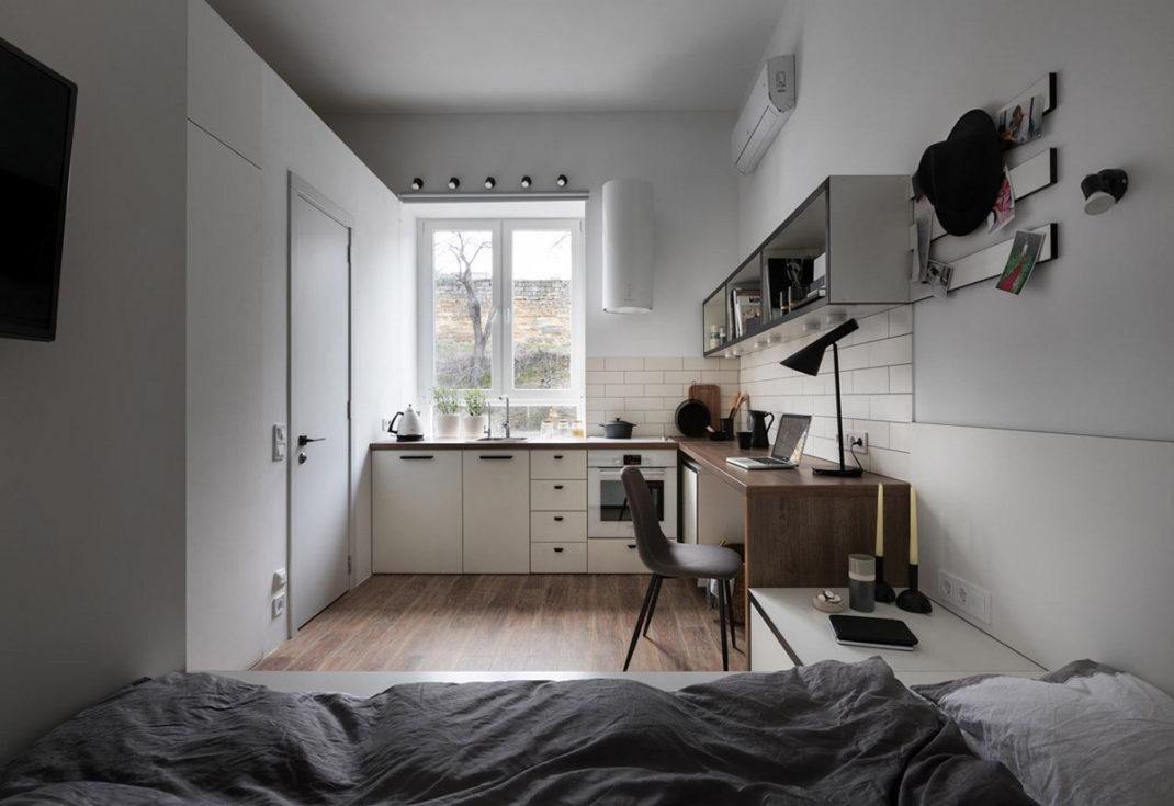 Pour agencer un studio de moins de 18 mètres carrés, vous allez bien évidement trouver des solutions spatiales astucieuses et opter pour un design d’intérieur compact. Mais le tout peut aboutir à une décoration très originale. C’est le studio Fateeva Design qui a re-décoré ce petit studio ukrainien situé dans le centre d’Odessa.