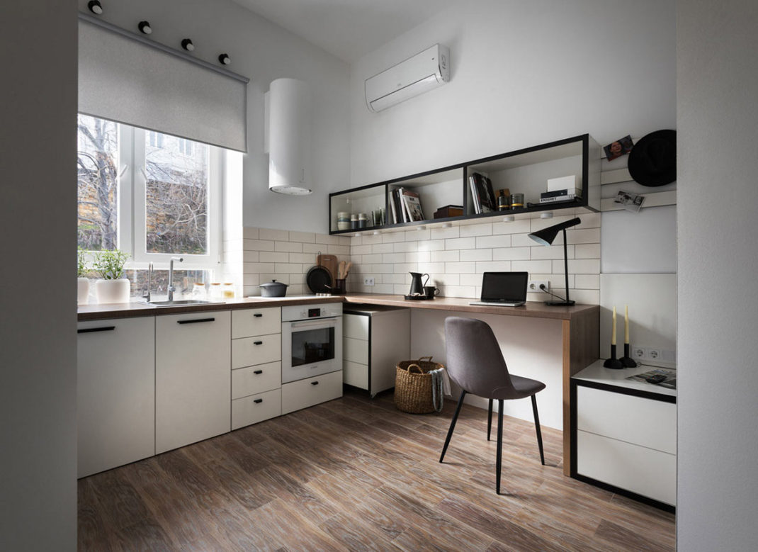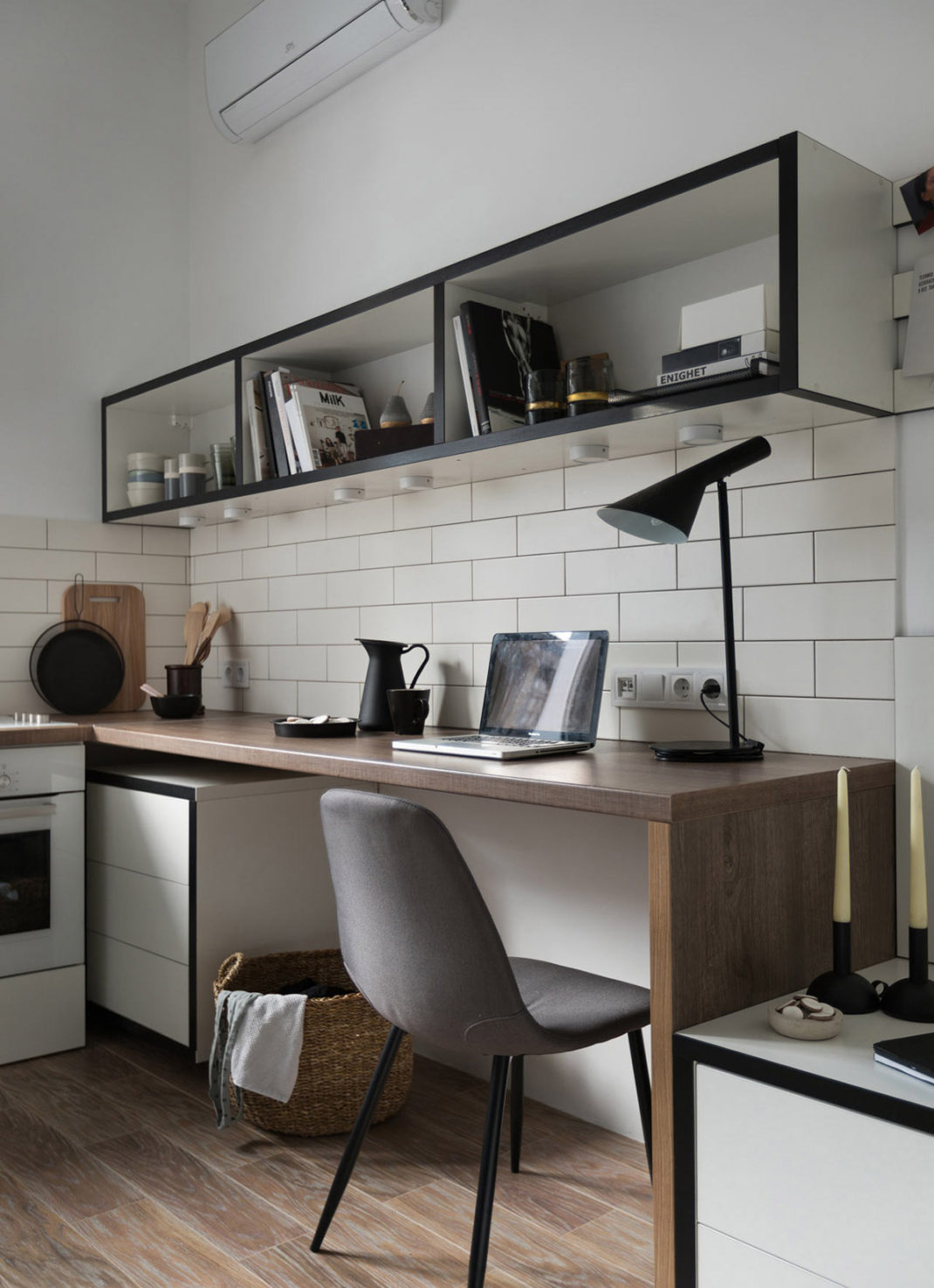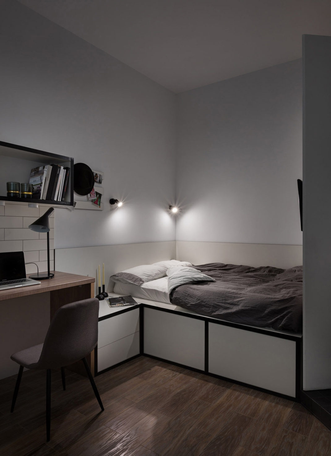 Fateeva Design a réussi à y installer une zone bureau, une zone nuit, une zone de rangement, une cuisine et une salle de bain. Première astuce : ce petit décroché en L qui peut être utilisé comme zone de travail et peut aussi servir d’espace pour cuisiner. Ce qui est intelligent ici, c’est que la crédence choisi est suffisamment neutre pour convenir à une cuisine qu’un bureau. C’est aussi le cas des étagères qui se trouvent juste au dessus. Il est aussi bien possible d’y ranger de la vaisselle que des livres.
