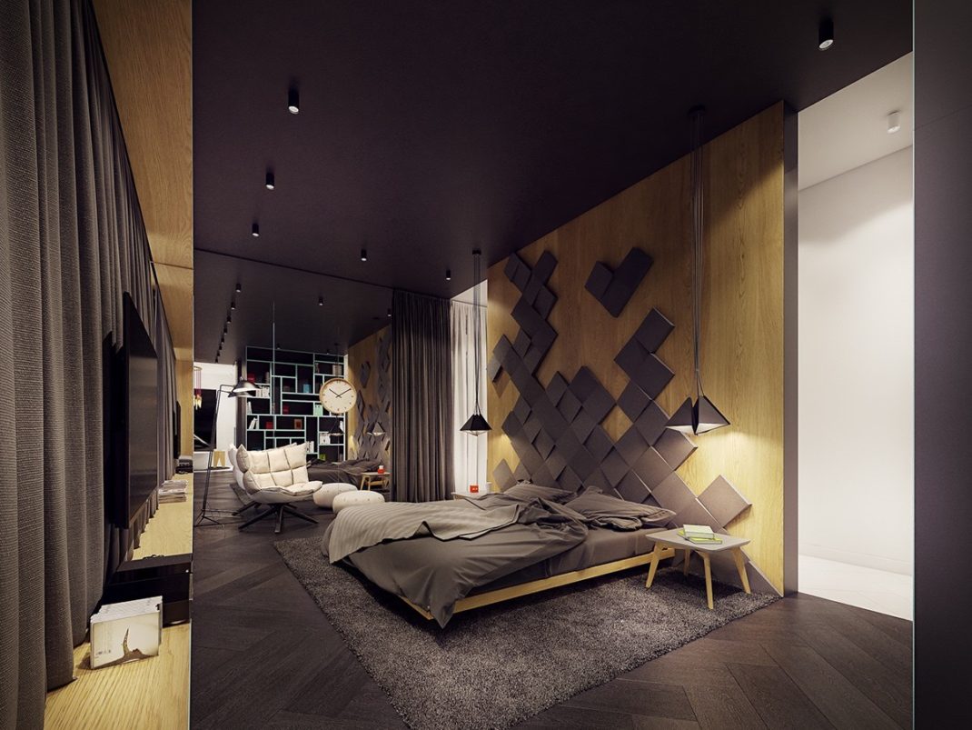 La chambre principale s’écarte des tons joyeux des chambres des enfants. Cette chambre est beaucoup plus nerveuse et raffinée. Le mur lambrissé en bois avec un motif en 3D gris foncé donne une vraie personnalité à la pièce. La pièce surprend également du fait des nombreux luminaires qui y ont été installés. Mention spéciale pour le dressing et son miroir qui donne l’impression d’un espace infini.