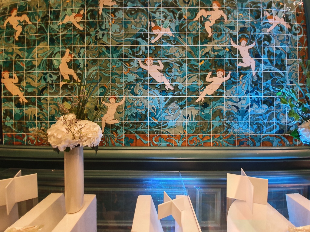 Pour l’occasion, Schneider Electric l’a donc sortie de l’ombre et (re)placée sous les feux de la rampe. C’est par une petite porte discrète, après un long couloir et derrière une grande porte battante que s’ouvre cette salle. Au programme : de nombreuses mosaïques, des fresques céramiques et des miroirs grimpants aux murs. Bref, le coup de cœur obligatoire et absolu !