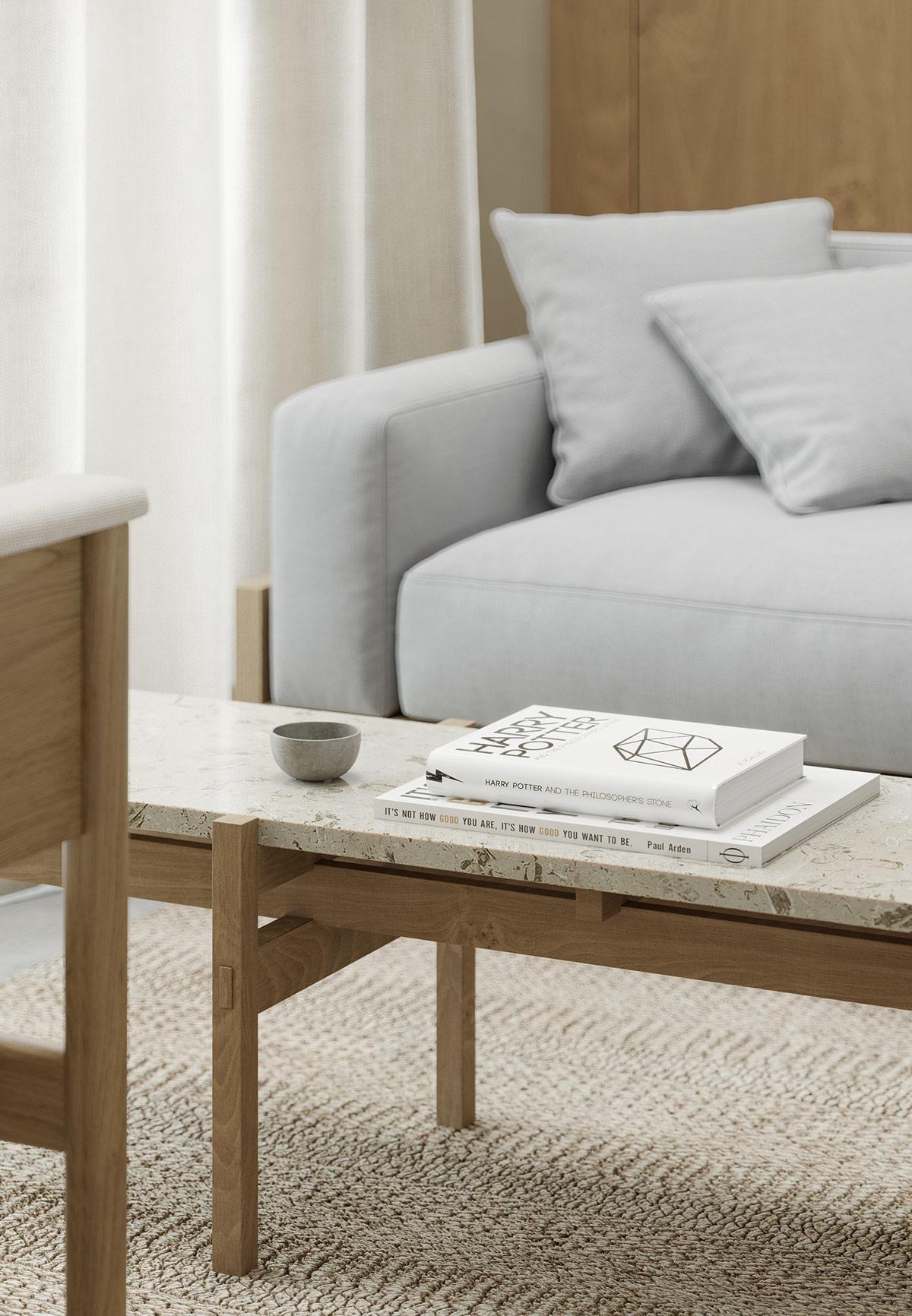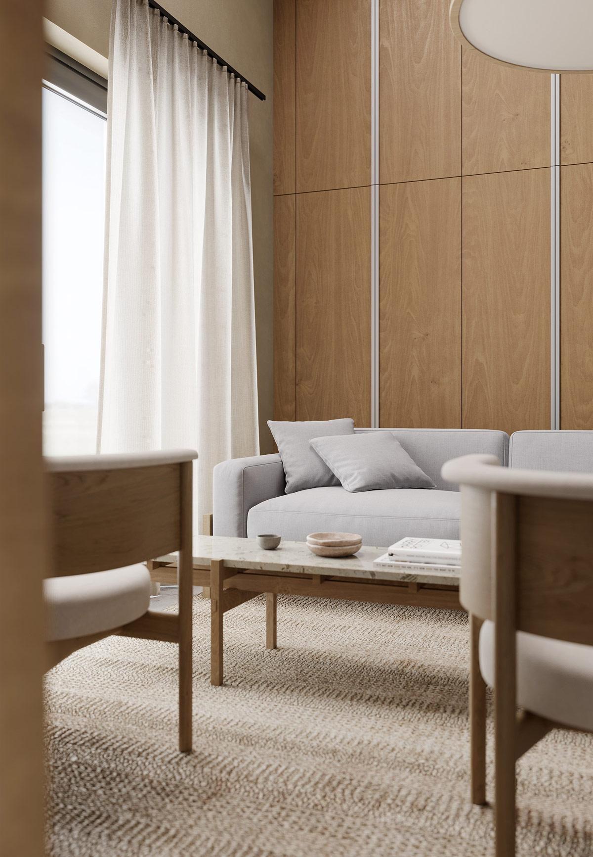 Un canapé moderne met un accent gris froid devant le mur aux tons chauds du bois. Tandis que des livres ornent une table basse en bois et en pierre. La table basse rectangulaire étroite se faufile dans le coin salon compact ; séparant le canapé de deux fauteuils modernes placés en face. Derrière, une étagère encastrée permet aux murs en stuc crème de rester épurés.