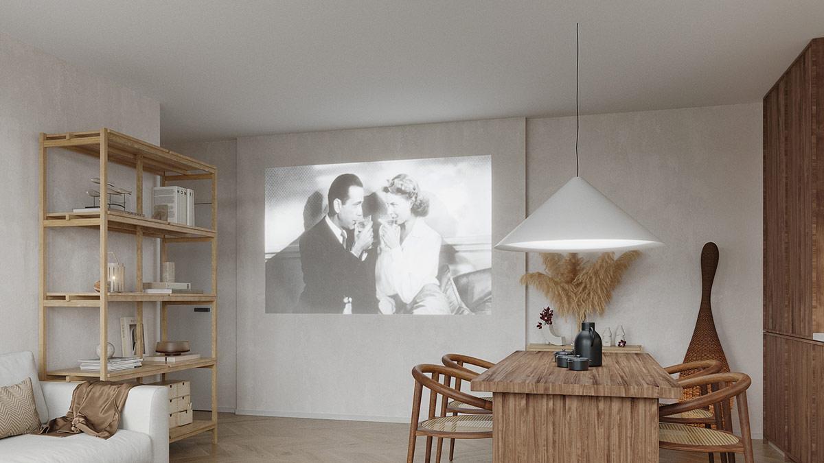 Une chaise longue, une petite table d’appoint et une plante d’intérieur mature s’insèrent dans l’espace de transition entre les zones, formant un joli coin lecture. Aussi, les murs blancs du salon ne se contentent pas de peindre un environnement paisible. Ils créent une toile de fond nette qui peut servir d’écran de projection sans souci lorsque cela est nécessaire.