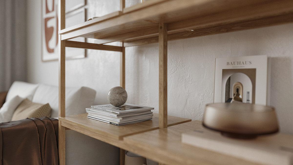 Un tapis de style scandinave monochrome déploie des motifs audacieux dans le petit coin salon et le sépare du reste de l’espace ouvert. L’étagère moderne en bois est légèrement quant à elle accessoirisée avec de petits objets décoratifs élégants ; qui n’attirent pas l’attention et n’encombrent pas l’intérieur aéré.