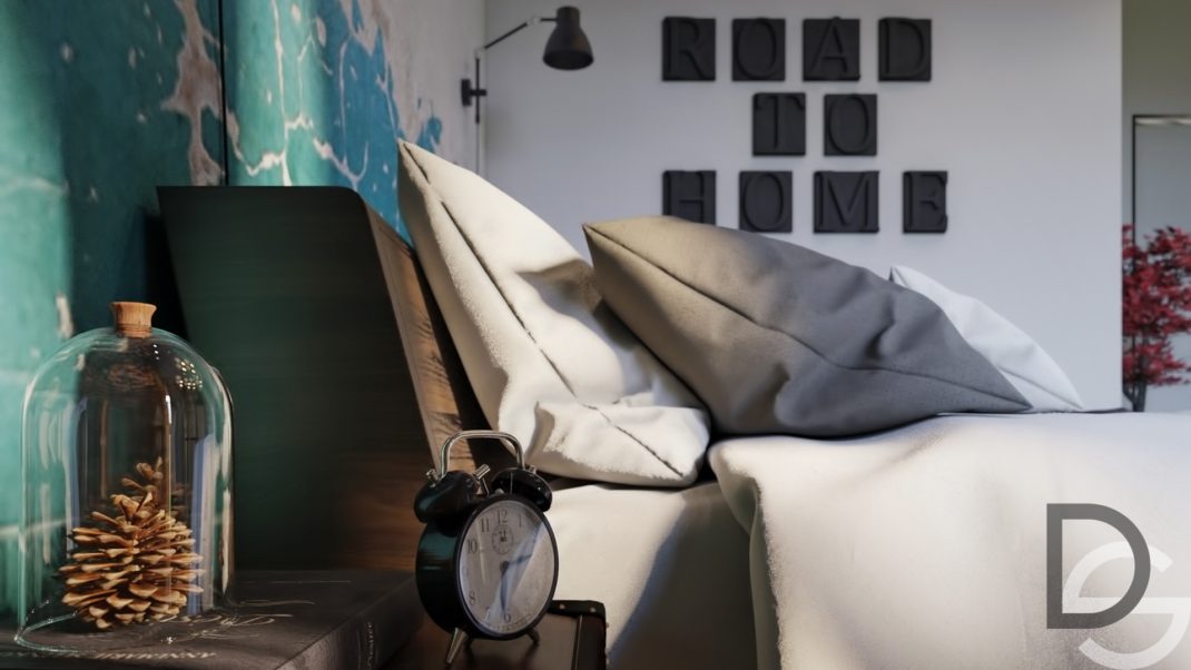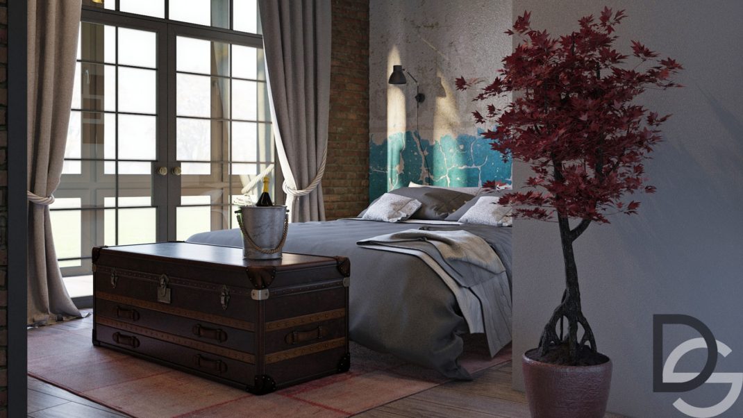 Passons maintenant dans la chambre de ce loft industriel. Nous y découvrons un lit adossé à un mur faussement défraîchi. Ce type de décoration est de plus en pus tendance. On essaie de créer une véritable peinture murale que l’on va vieillir artificiellement. Certains trouveront l’idée stupide mais moi je la trouve créative et pleine de cachet. Bien évidement, je ne vous incite pas à faire cela sur tous les murs de votre maison ; mais sur un mur d’une pièce donné, vous verrez le résultat est bluffant.